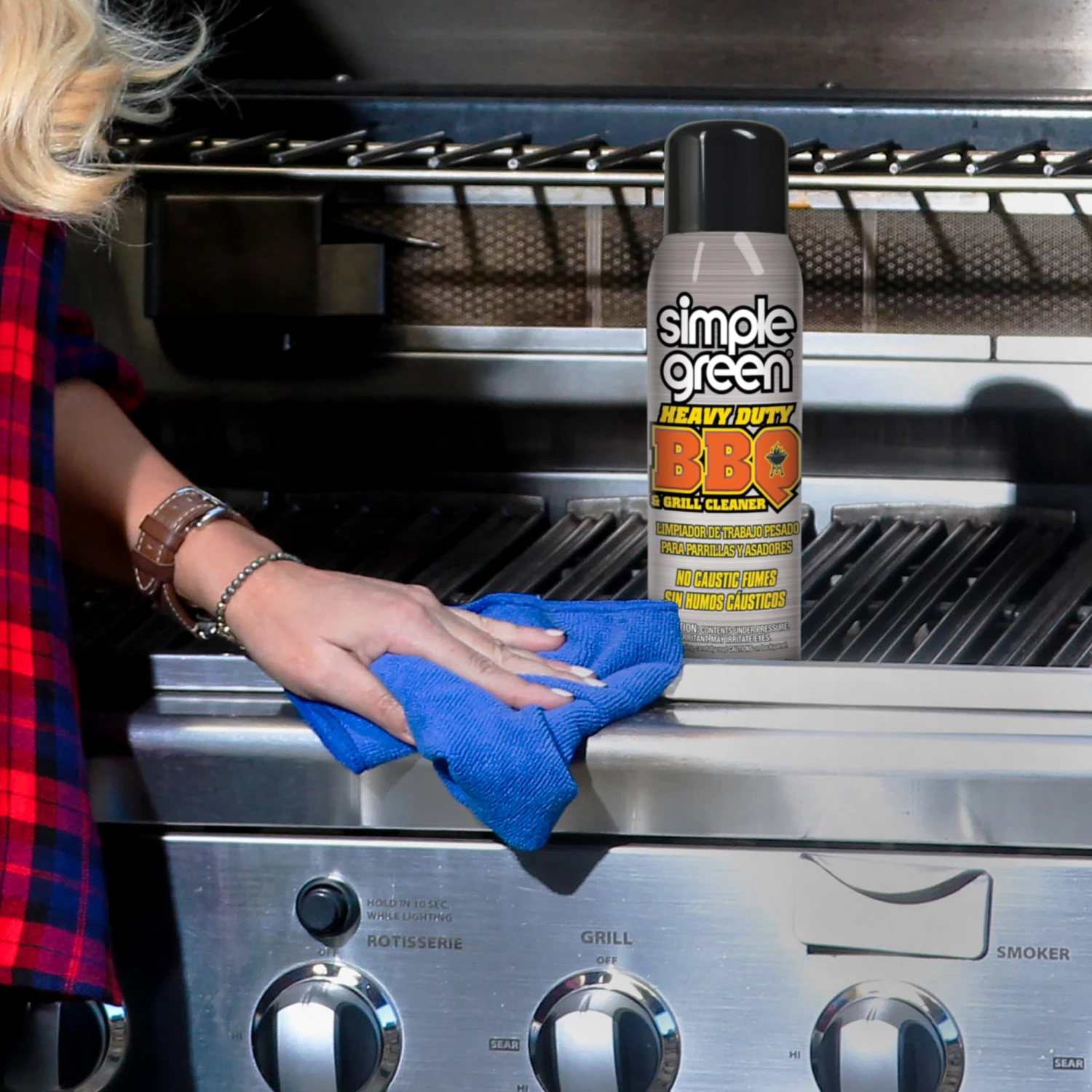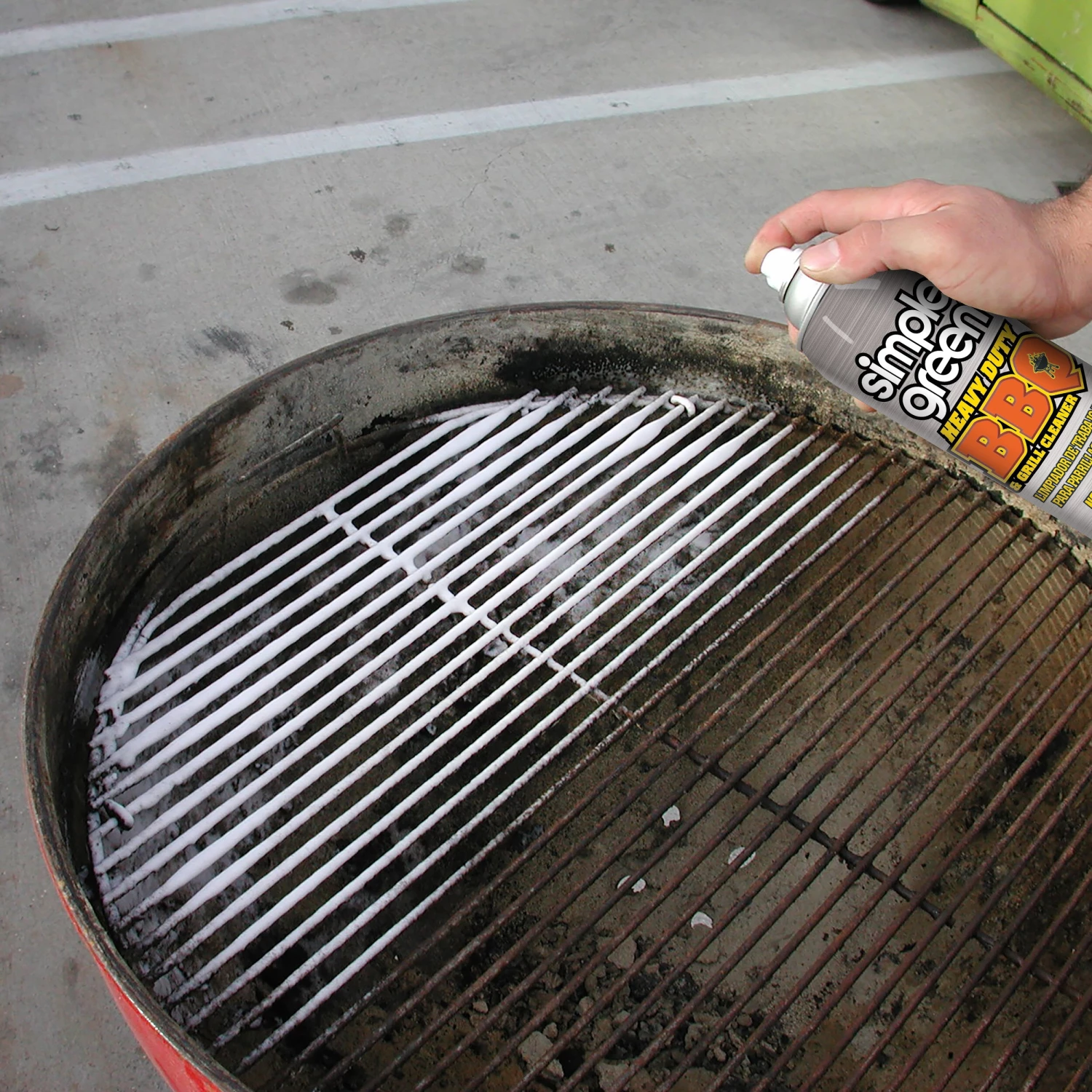 Simple Green Heavy Duty BBQ and Grill Cleaner cleans heavy grease build-up, baked-on food and carbon deposits on grates, stainless steel parts, smokers, BBQ covers and more. The residue-free formula is safer for use on cooking surfaces. The spray foam clings to vertical surfaces and hard-to-reach areas and contains no added color or scent. The non-flammable, non-abrasive and non-corrosive formula safely cleans steel, aluminum, plastic and more.