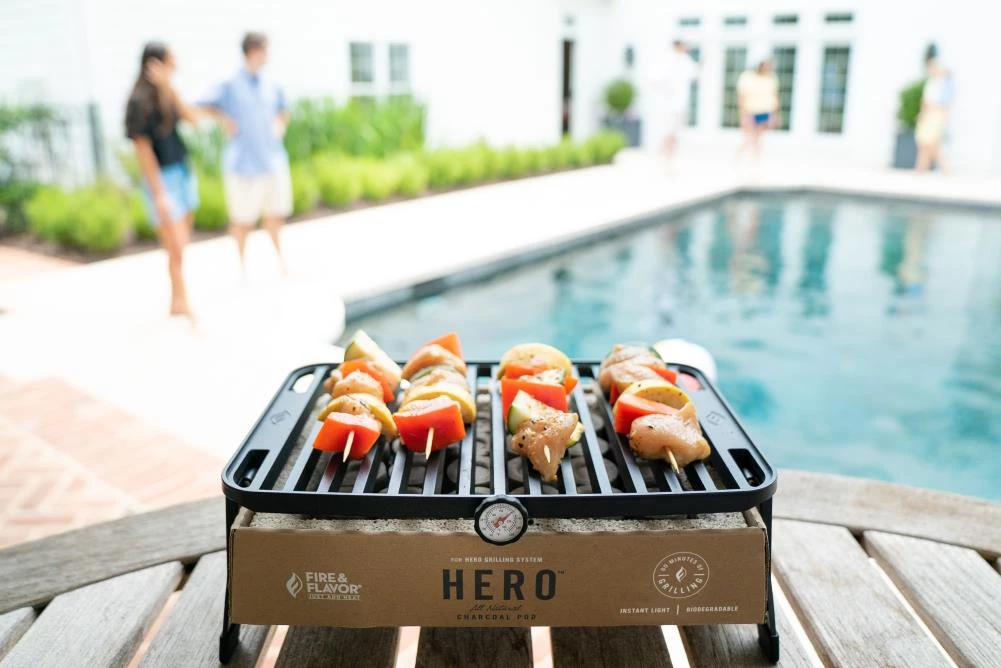 Hero™ makes grilling simple, clean, and portable. It features a fast set up and no mess, eco-friendly charcoal pods that are ready in ten minutes to give you an hour of grill time. The grill is dishwasher safe, making clean up fast and easy. The charcoal pods are an environmentally friendly fuel choice compared to petroleum based alternatives.