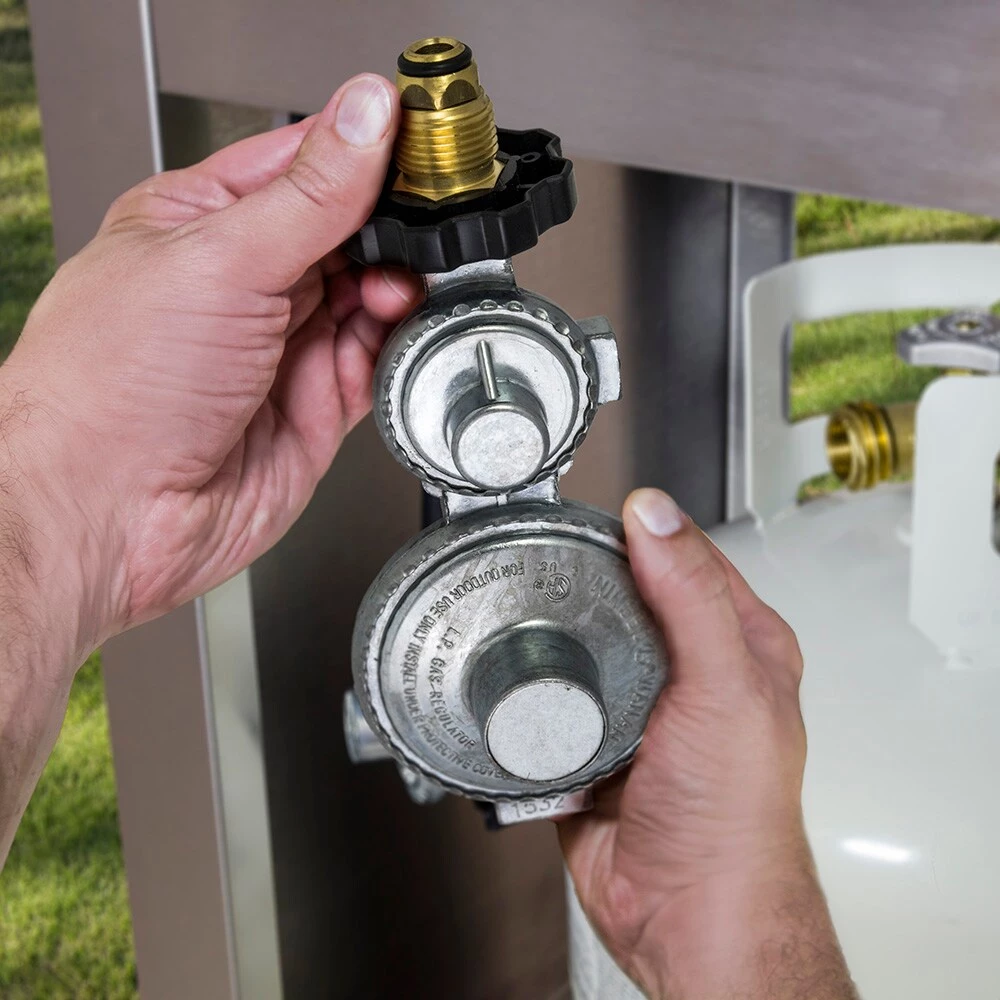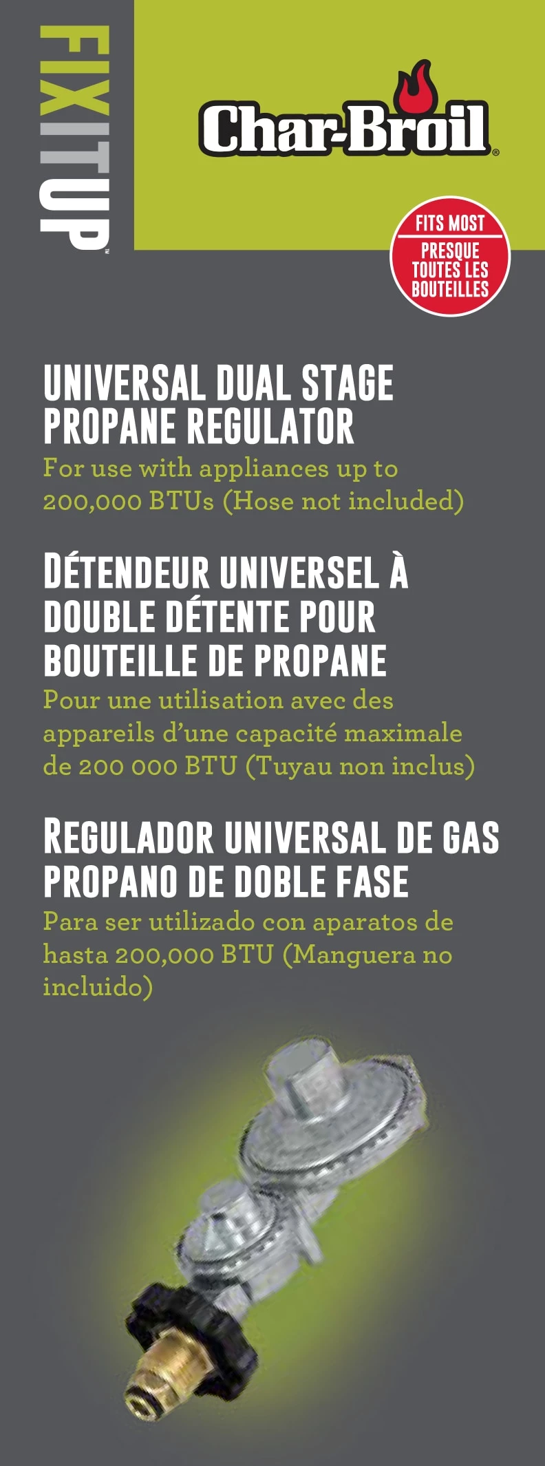 The Char-Broil dual-stage propane tank regulator regulates pressure from propane cylinder to appliance. This quick connection combines a high pressure first-stage regulator and low pressure second stage regulator in one unit. This regulator is suitable for use with any low pressure propane appliance rated up to 200,000 BTU per hour.