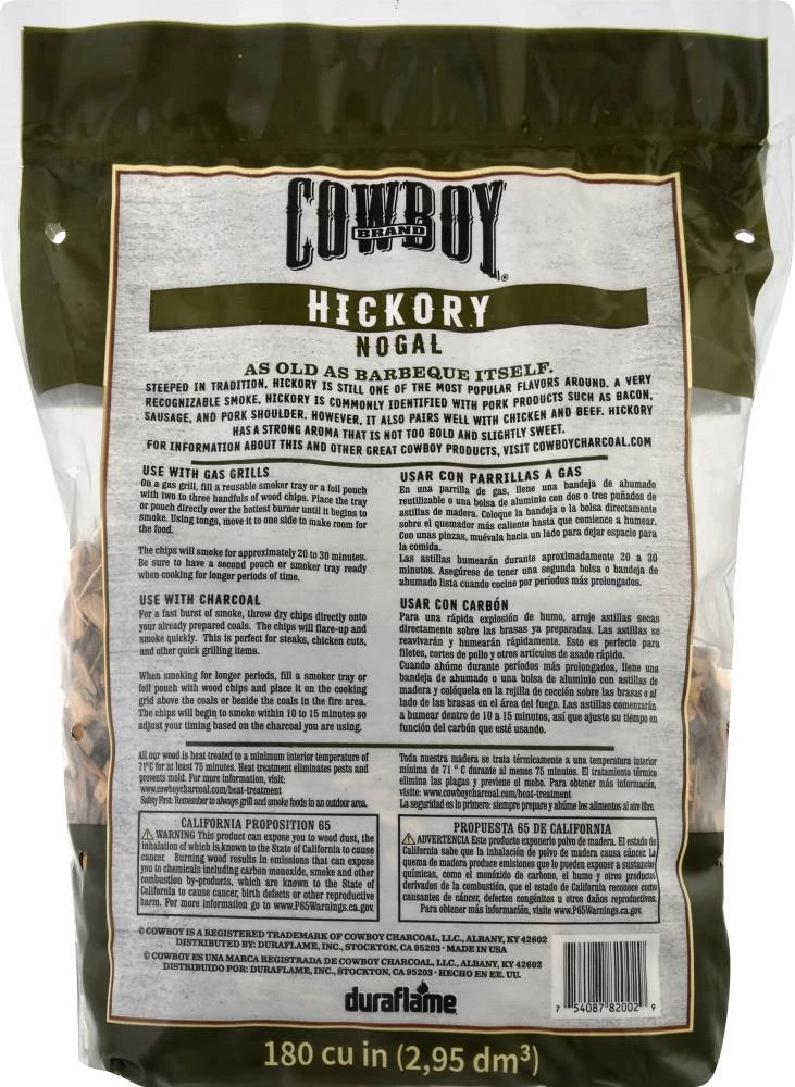 For hundreds of years hickory has been the preferred wood of American pit masters. Its hearty aroma and full flavor give meat an unmistakable woodsy taste that makes it a favorite of competition cooks and backyard chefs across the country. Cowboy hickory wood chips are a healthy, zero calorie, no-sodium and nonfat way to flavor foods. Use in charcoal or gas grills.