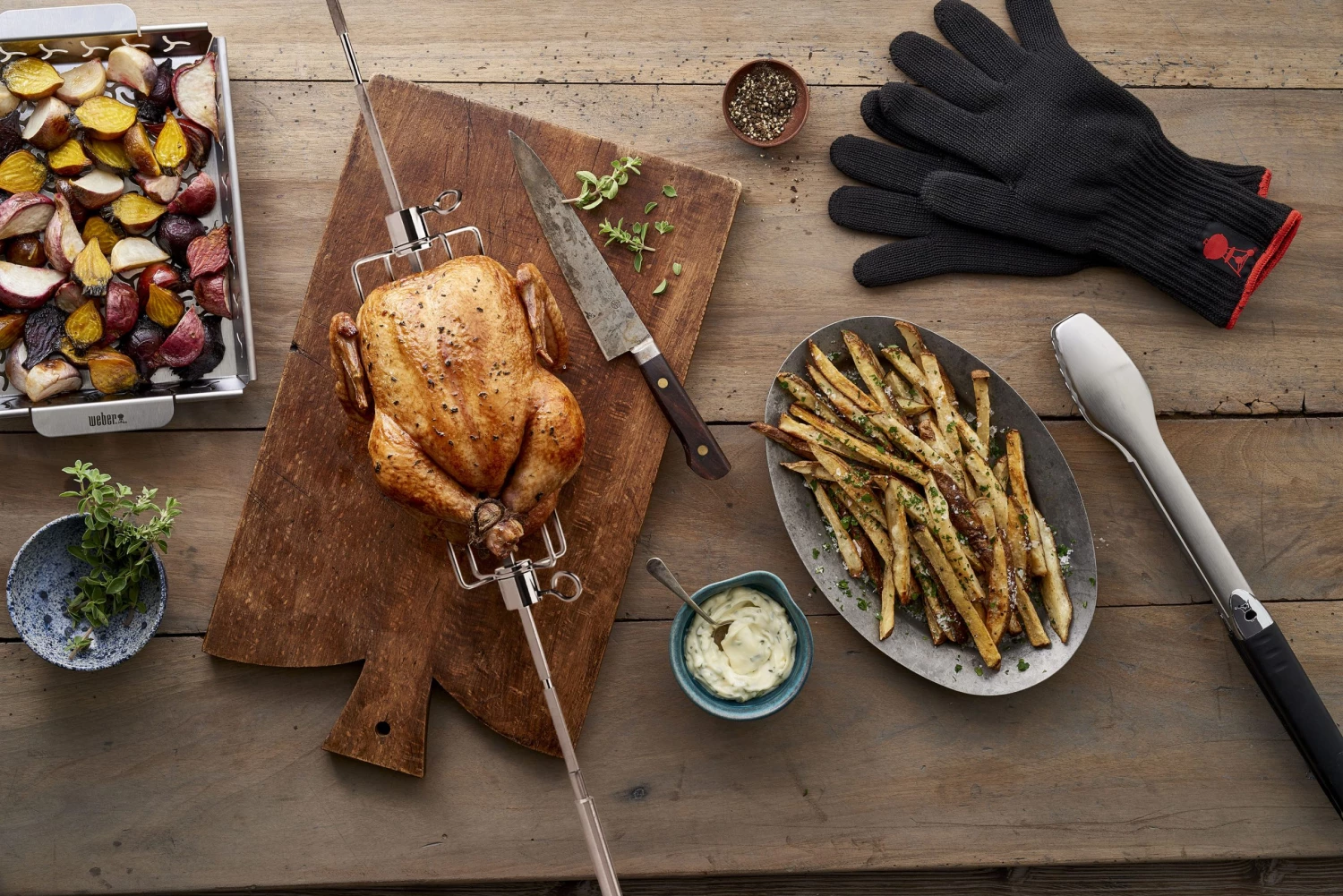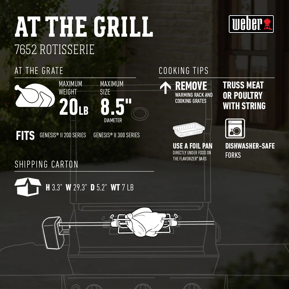 Turn your grill into a backyard rotisserie. Slow-roast a crispy yet moist whole chicken to tender ribs. The rotisserie gently rotates food above the cooking grate, producing succulent, self-basted meat directly from your backyard kitchen.
