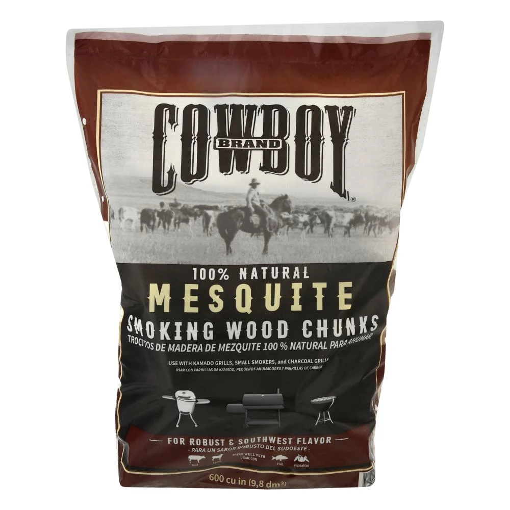 Cowboy® 100% all natural Mesquite wood chunks add a smoky flavor to your grilled foods. The unique sweet aroma of Mesquite wood adds a western taste that goes well with any meat, but pairs particularly well with beef and chicken. These Mesquite wood chunks are larger than chips, making it easy to maintain a steady long-term smoke source.