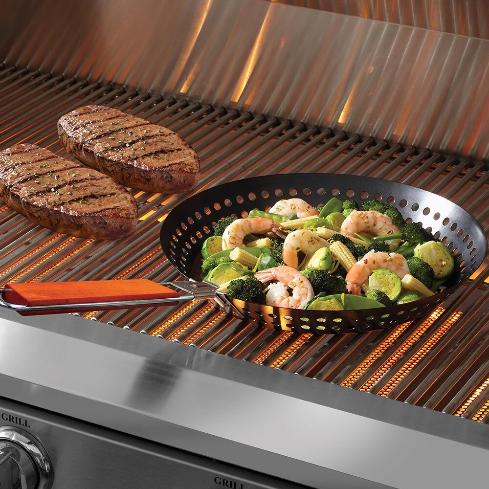 Ever grill something to near-perfection only to have it fall through the grate at the last second? No more of that nonsense! This non-stick grilling skillet from Blue Rhino® is the perfect solution for grilling small and delicate foods such as vegetables and seafood. Not only is your food safe, but you are as well with the removable handle. Detach the handle so you can close the lid of your grill while cooking, then reattach to remove your food when it’s done.