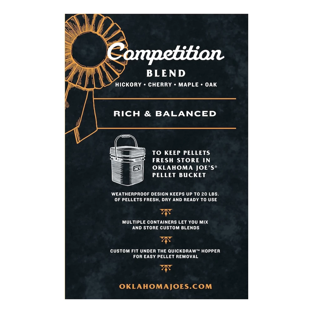 Infuse your beef, chicken, pork, fruit and vegetables with the sweet and smoky flavor of Oklahoma Joe’s® Competition Blend Wood Pellets. These ultra-premium pellets are 100% natural, hardwood, food-grade pellets. They’re clean burning with low ash for easy clean-up and available in 20-pound bags.