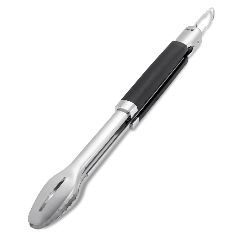 Handling food on the grill is easy with Precision Grill Tongs. The durable stainless-steel construction and soft-touch handle provide complete control with a comfort hold. The flat front edge design allows you to easily get under food as you lift and turn fragile foods like vegetables and fish, while the precision grip makes moving a heavy rack of ribs effortless. The hands-free locking mechanism closes the tongs for quick and easy use and compact storage.