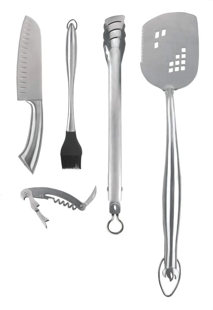 - Set includes spatula, locking tongs, chef knife, basting brush, and corkscrew