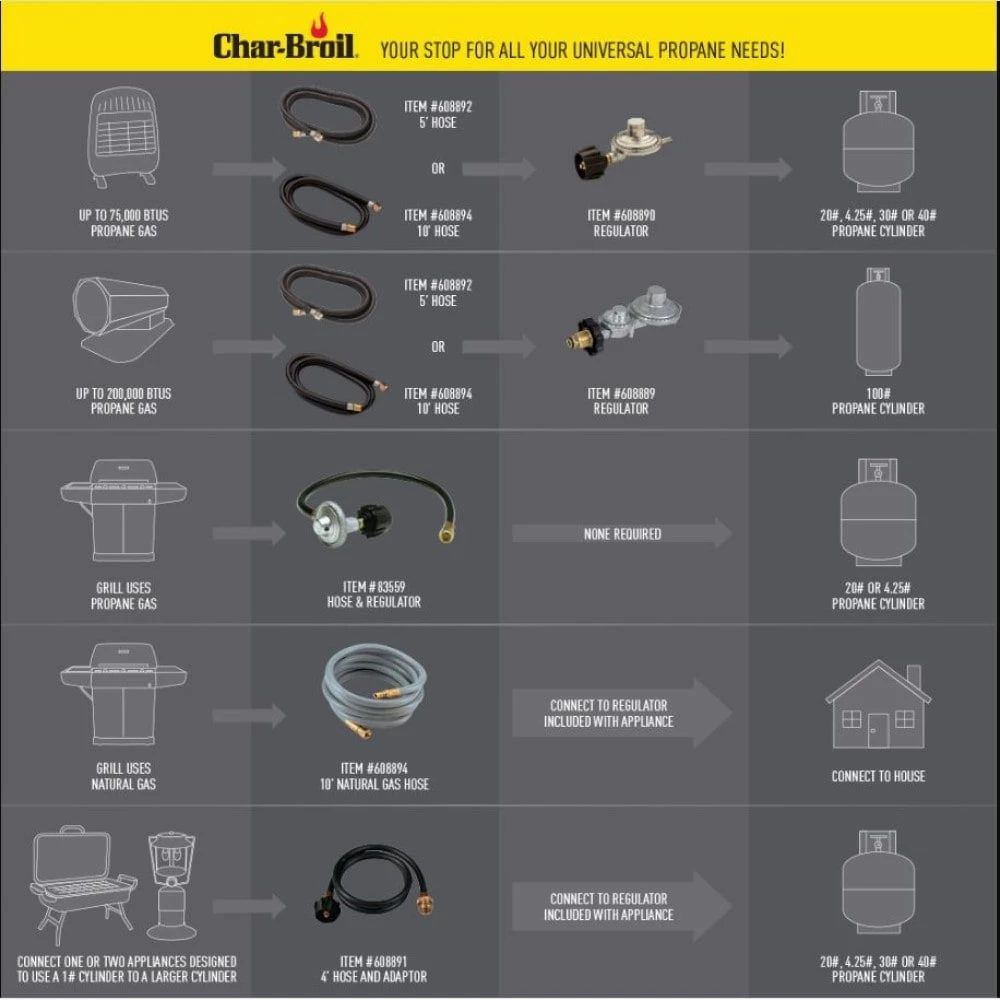 Designed to fit most grills, this 20” universal low-pressure hose and regulator kit connects to type-1 fittings with side burners. And don’t worry about the elements beating up the hose; it’s weather proof and built to last.