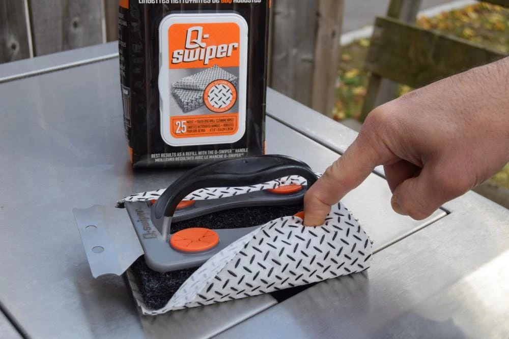 The Proud Grill Q-SWIPER® BBQ Grill Cleaner is a new bristle free and wire free way to safely swipe away grease and grime for a clean and healthy grill every time you barbecue. This patented grill grate cleaner combines the Q-SWIPER Grill Brush and scraper with our tough, moist Q-SWIPER BBQ grill cleaning wipes to safely remove tough grease and grime. Our wipes use recognized food contact safe ingredients and natural cleaning agents and are safe to use on all grill grate surfaces including stainless steel, porcelain coated and cast iron.
